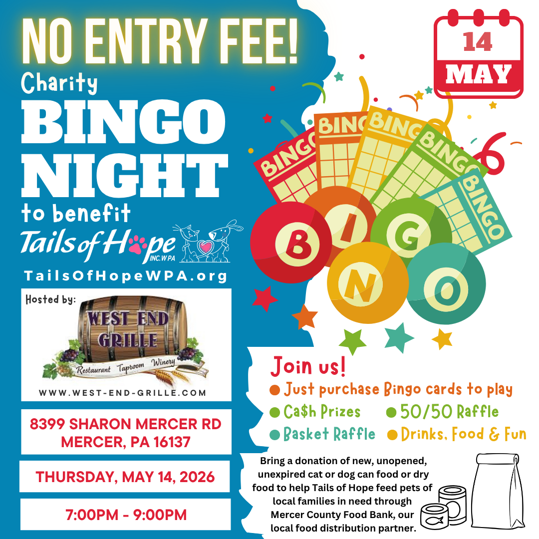 Charity Bingo Night Thursday, May 14, 2026 7:00 PM 9:00 PM West End Grille 8399 Sharon-Mercer Road Mercer, PA, 16137 United States (map) Google Calendar ICS