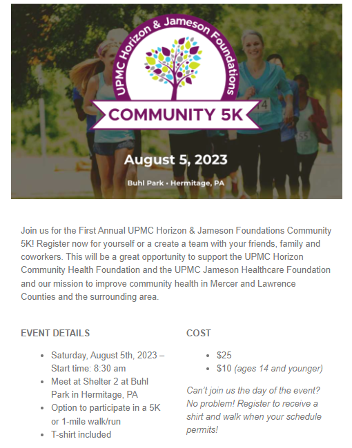 Community 5K Saturday, August 5, 2023 8:30 AM 12:00 PM Buhl Park 715 Hazen Road Hermitage, PA, 16148 United States (map) Google Calendar ICS Register