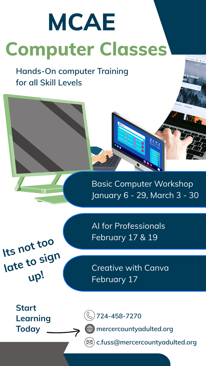 Back to All Events Create With Canva Tuesday, February 17, 2026 5:30 PM 6:30 PM Mercer County Adult Education 233 George Junior Road Grove City, PA, 16127 United States (map) Google Calendar ICS