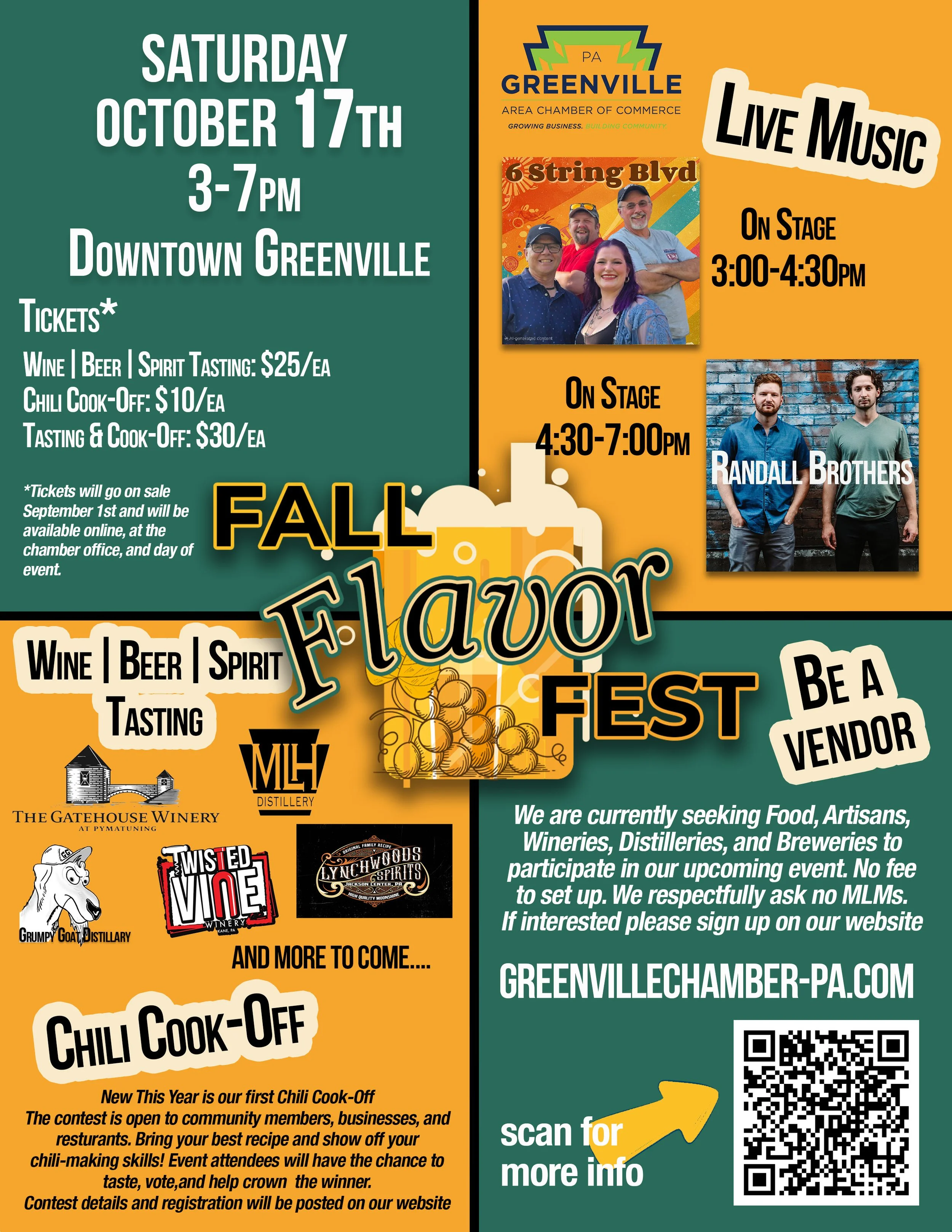 Back to All Events Fall Flavor Fest Saturday, October 17, 2026 3:00 PM 7:00 PM Greenville Area Chamber of Commerce 182 Main Street Greenville, PA 16125 United States (map) Google Calendar ICS