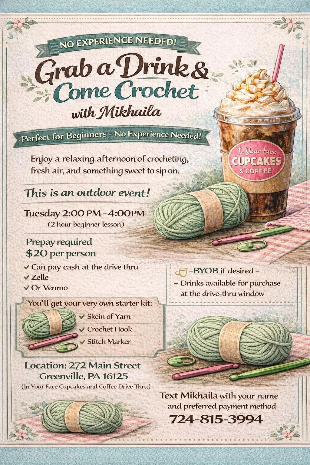 Back to All Events Grab a Drink & Come Crochet Tuesday, May 5, 2026 2:00 PM 4:00 PM In Your Face Cupcakes 272 Main Street Greenville, PA 16125 United States (map) Google Calendar ICS