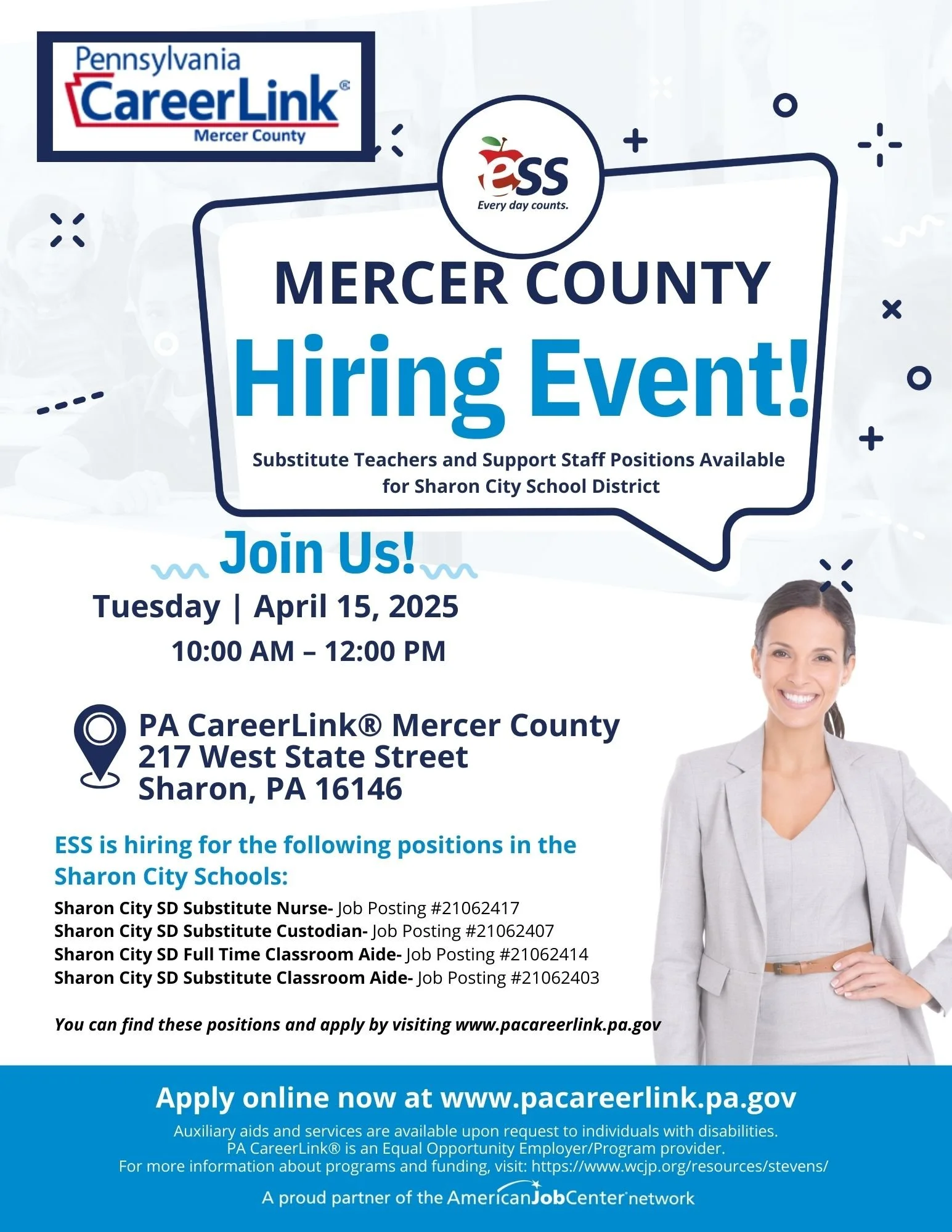 Hiring Event - ESS Tuesday, April 15, 2025 10:00 AM 12:00 PM PA CareerLink 217 West State Street Sharon, PA, 16146 United States (map) Google Calendar ICS
