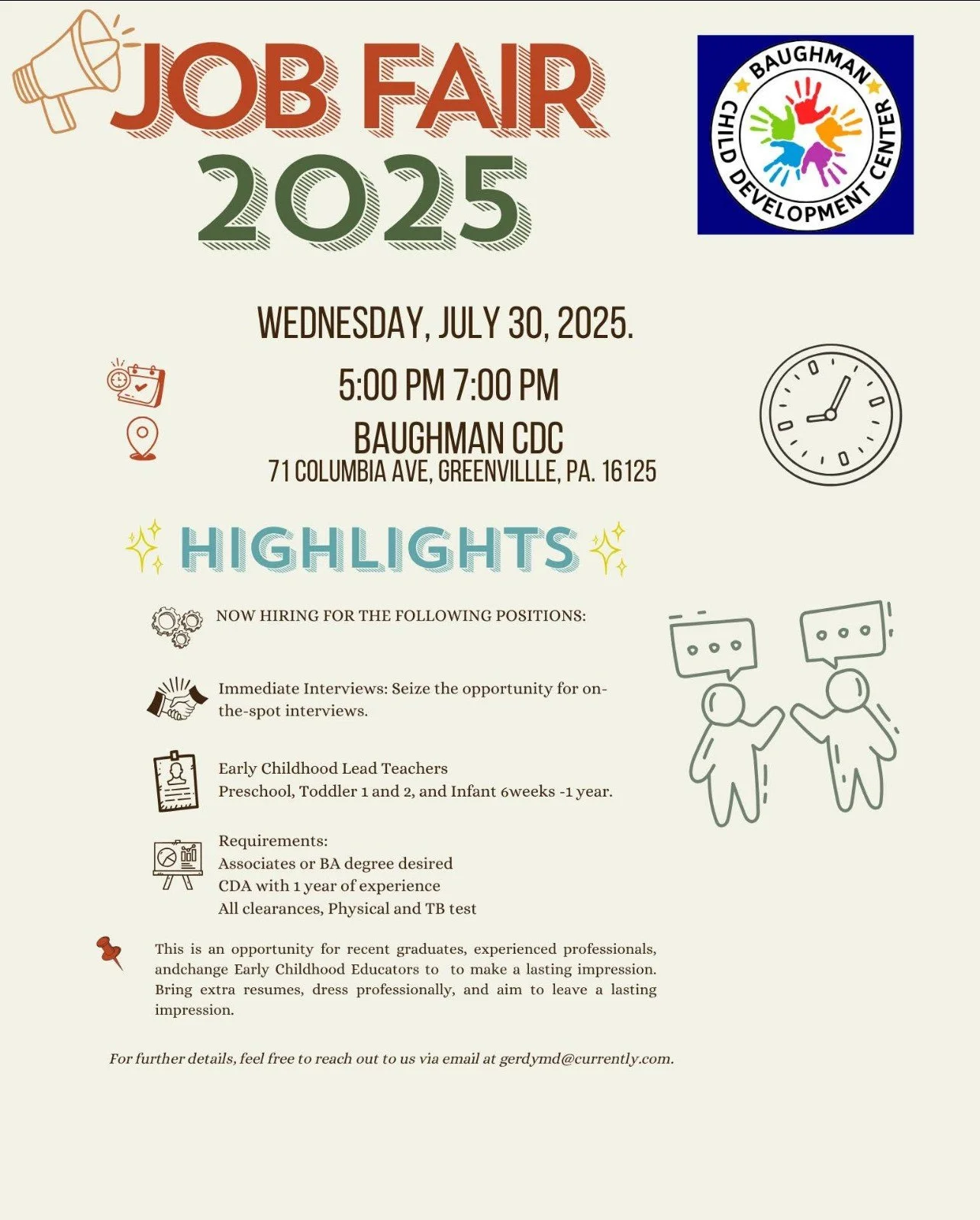 Job Fair 2025 Wednesday, July 30, 2025 5:00 PM 7:00 PM Baughman CDC 71 Columbia Avenue Greenville, PA, 16125 United States (map) Google Calendar ICS
