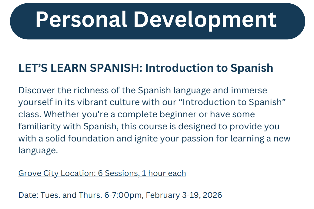 Back to All Events Learn Basic Spanish Tuesday, February 3, 2026 6:00 PM 7:00 PM Mercer County Adult Education 233 George Junior Road Grove City, PA, 16127 United States (map) Google Calendar ICS