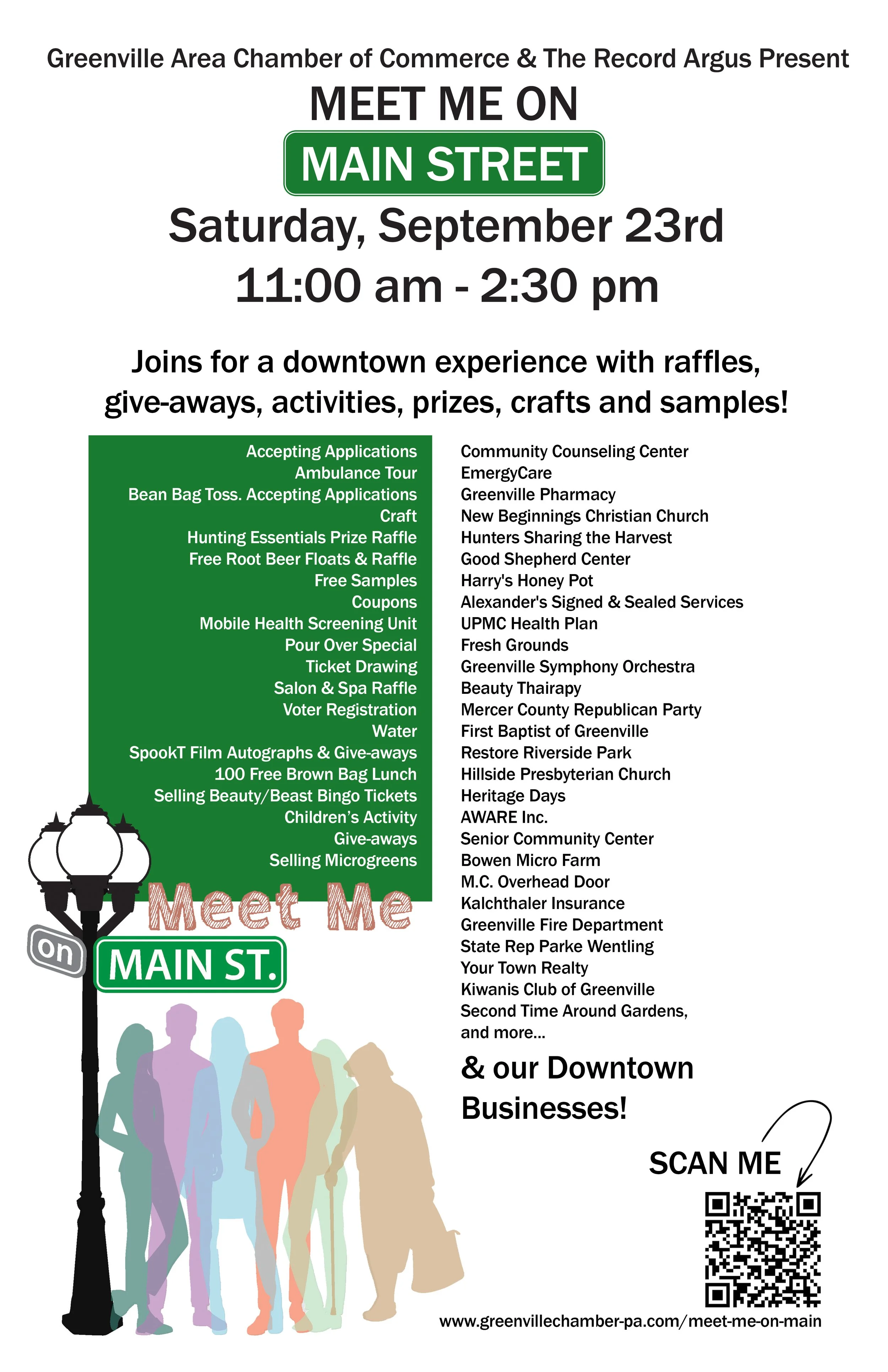 Back to All Events Meet Me on Main Street Saturday, September 23, 2023 11:00 AM 2:30 PM Downtown Greenville 182 Main Street Greenville, PA 16125 (map) Google Calendar ICS Learn more