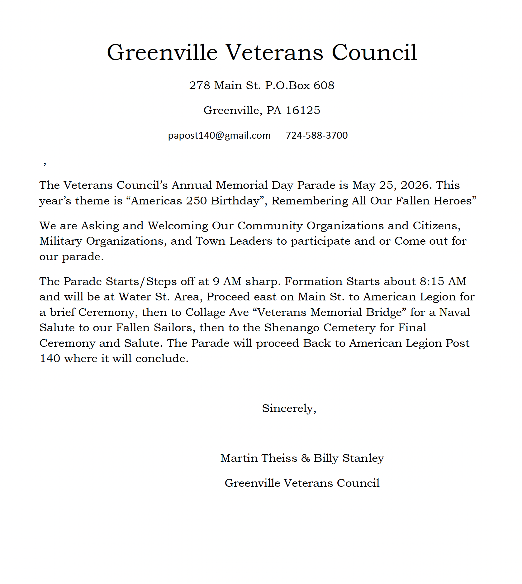 Memorial Day Parade Monday, May 25, 2026 9:00 AM 10:00 AM Downtown Greenville Main Street Greenville, PA 16125 United States (map) Google Calendar ICS