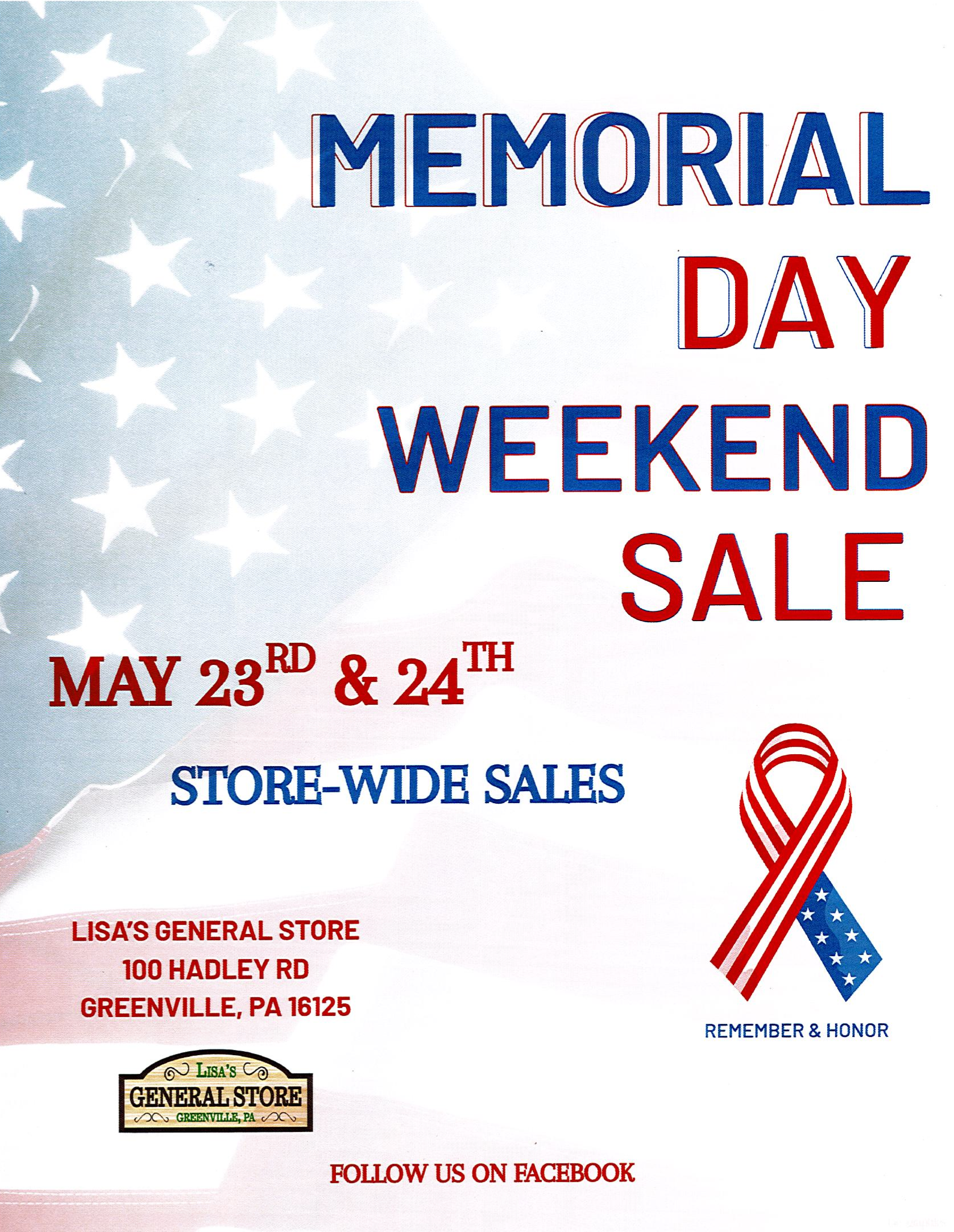 Back to All Events Memorial Day Weekend Sale Saturday, May 23, 2026 8:00 AM 5:00 PM Lisa's General Store 100 Hadley Rd Greenville, PA 16125 United States (map) Google Calendar ICS