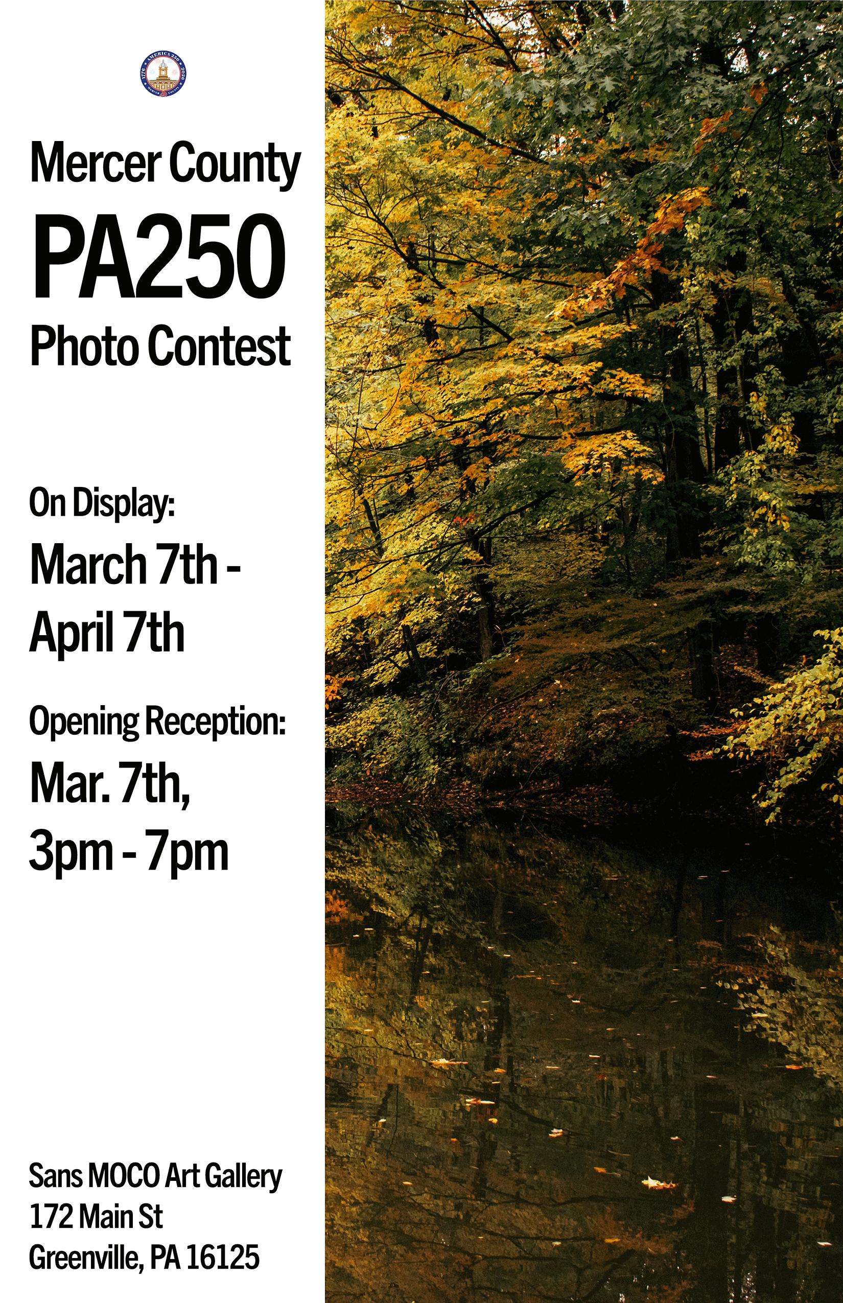 Mercer County PA250 Photo Contest Saturday, March 7, 2026 3:00 PM 7:00 PM Sans MOCO Art Gallery 172 Main Street Greenville, PA 16125 United States (map) Google Calendar ICS
