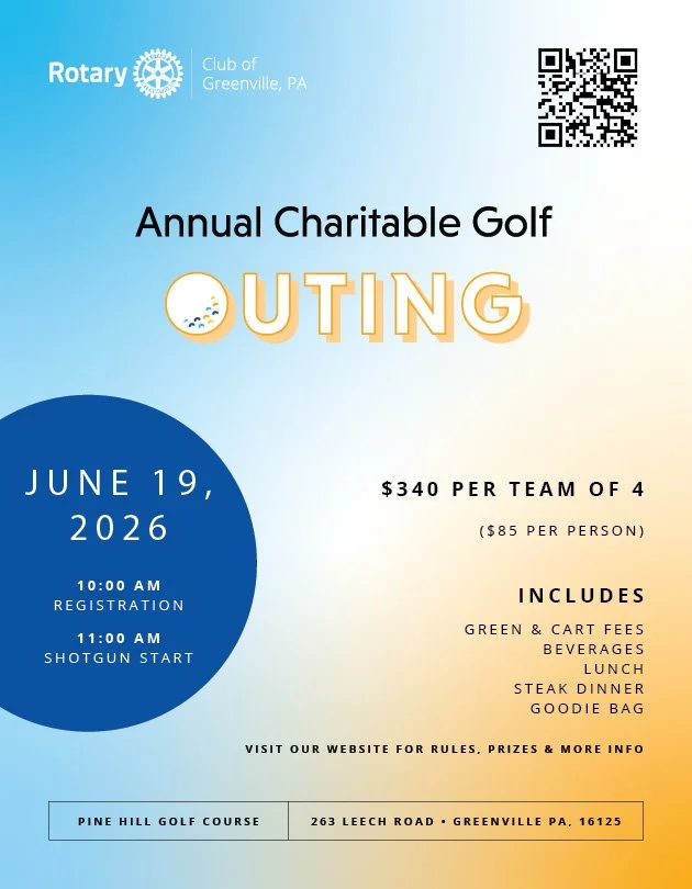 Rotary Annual Charitable Golf Outing Friday, June 19, 2026 10:00 AM 5:00 PM Pine Hill Golf Course 263 Leech Rd Greenville, PA 16125 United States (map) Google Calendar ICS Register Here