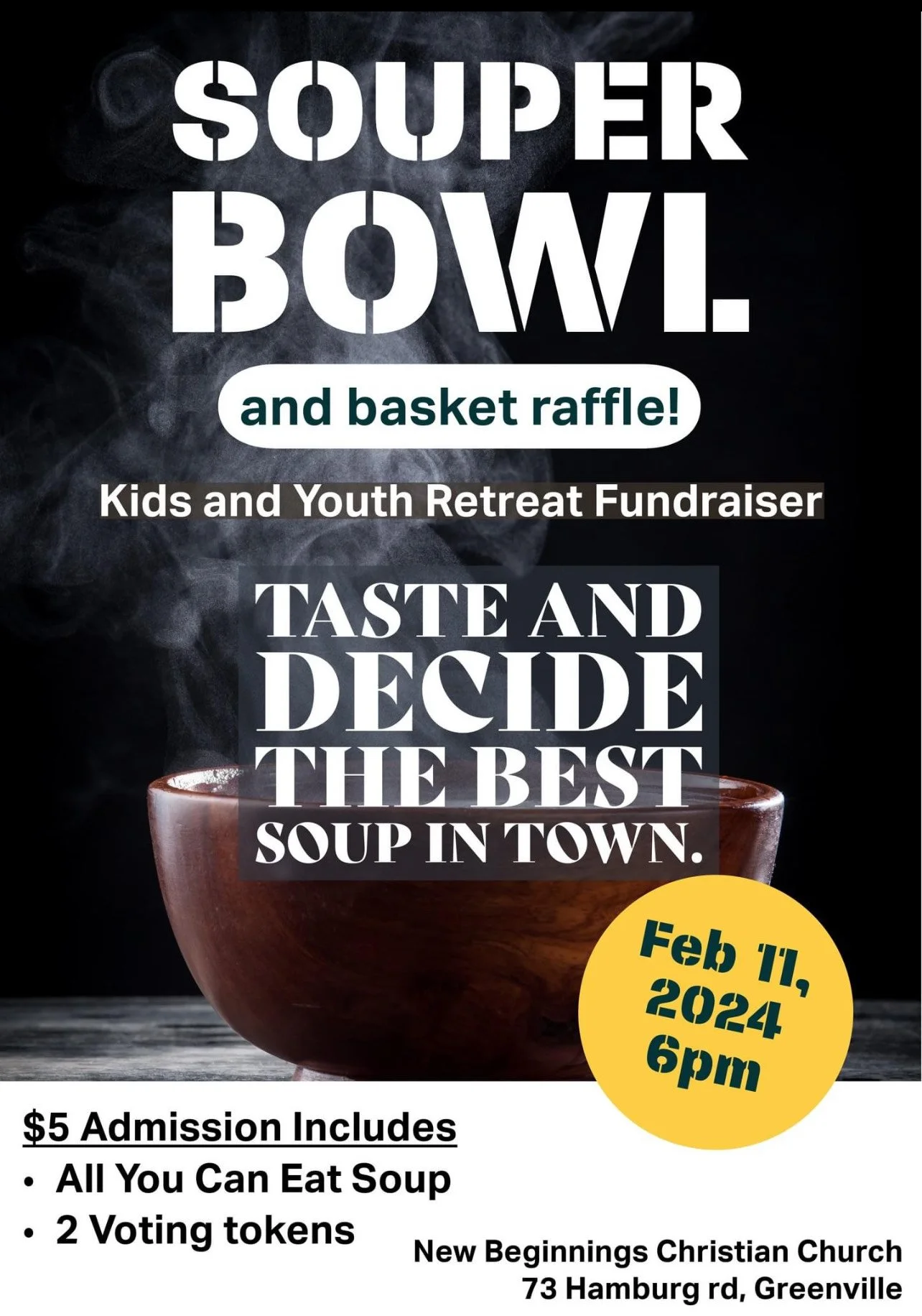 Back to All Events Souper Bowl Sunday, February 11, 2024 6:00 PM 7:30 PM New Beginnings Christian Church 73 Hamburg Road Greenville, PA, 16125 United States (map) Google Calendar ICS