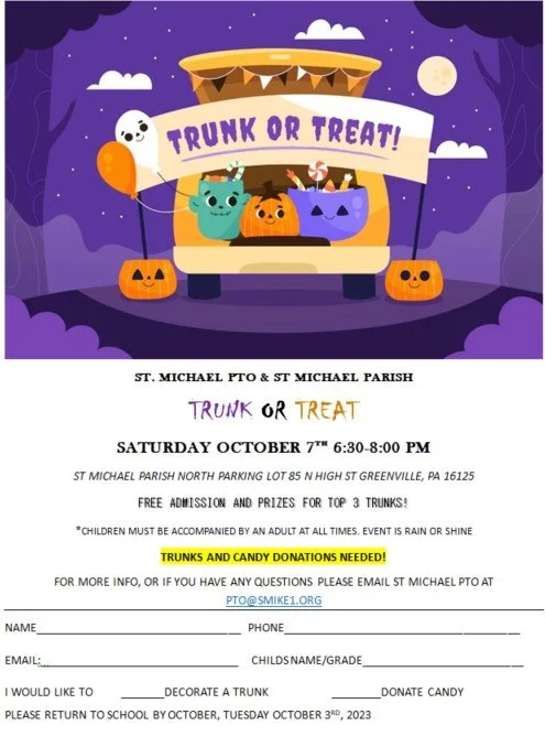 Trunk or Treat Saturday, October 7, 2023 6:30 PM 8:00 PM St Michael Parish North Parking Lot 85 North High Street Greenville, PA, 16125 United States (map) Google Calendar ICS Download
