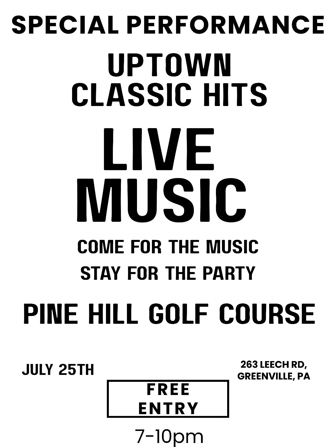 Back to All Events Uptown Classic Hits Friday, July 25, 2025 7:00 PM 10:00 PM Pine Hill Golf Course 263 Leech Road Greenville, PA, 16125 United States (map) Google Calendar ICS
